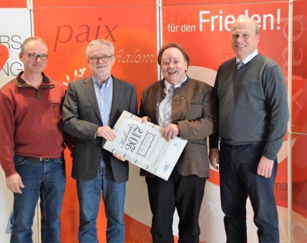 Bild: Oskar Sperl (links), der die Organisation für den Kalender übernommen hat und erster Vorsitzender des Gewerbevereins Christoph Skrabal (zweiter von rechts) überreichen den Kalender an Dr. Josef Kindler, Vorsitzenden des Fördervereins und Bürgermeister Christian Kiendl (rechts).